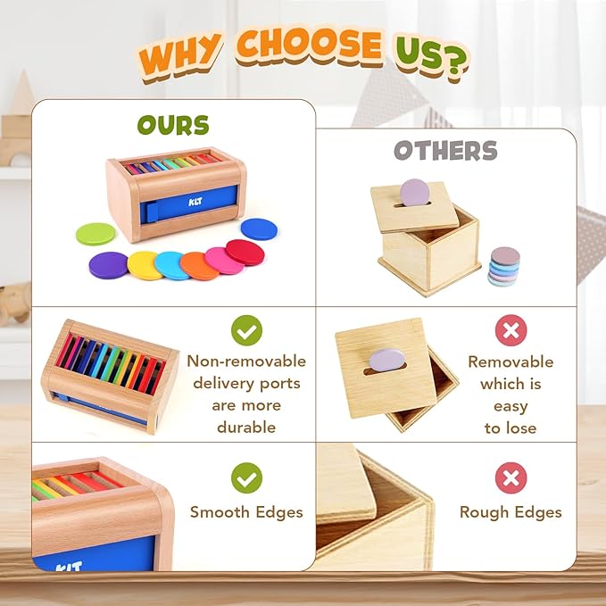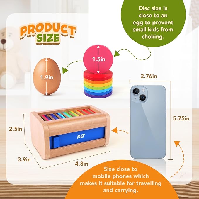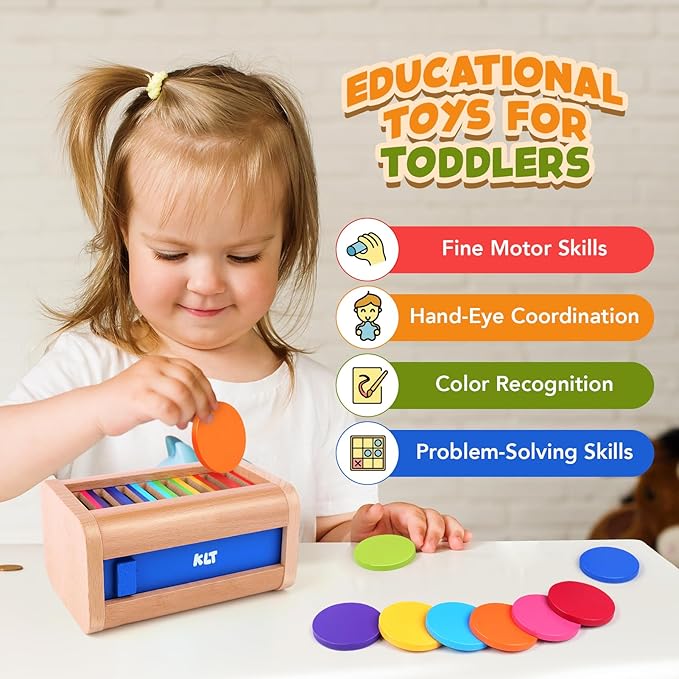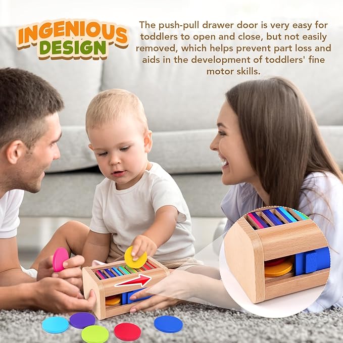 - Wooden Coin Box for Toddlers: Montessori Toys for 1+ year old with 8 colored discs and a slide door to lock and keep all pieces together! These color sorting sensory toys are fantastic for engaging and educating children. It enhances fine motor skills, hand-eye coordination, color sorting, and problem-solving abilities, offering double the fun and learning for children aged 1-3 years