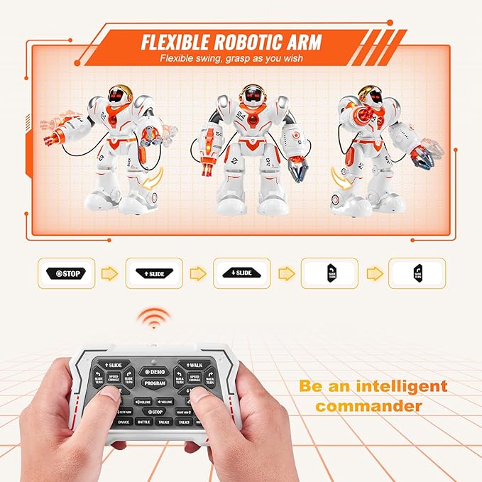 - ✅ [Smart Programming]: Use the remote to program up to 50 action combos. Kids can create custom routines and see the robot toy follow their commands, making learning logic and creativity fun.