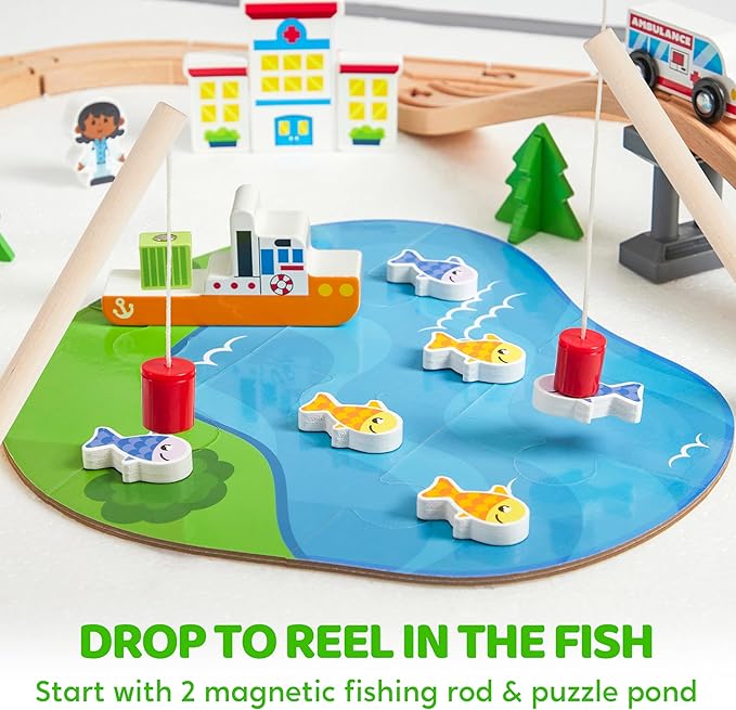 - Puzzle & Fishing Fun: Adding an interactive twist, this train set for toddlers includes a puzzle feature, allowing children to "build" a fishing pond for the town. Equipped with 2 fishing rods and 6 magnetic fish toys, it provides a playful challenge—who can catch the most fish?