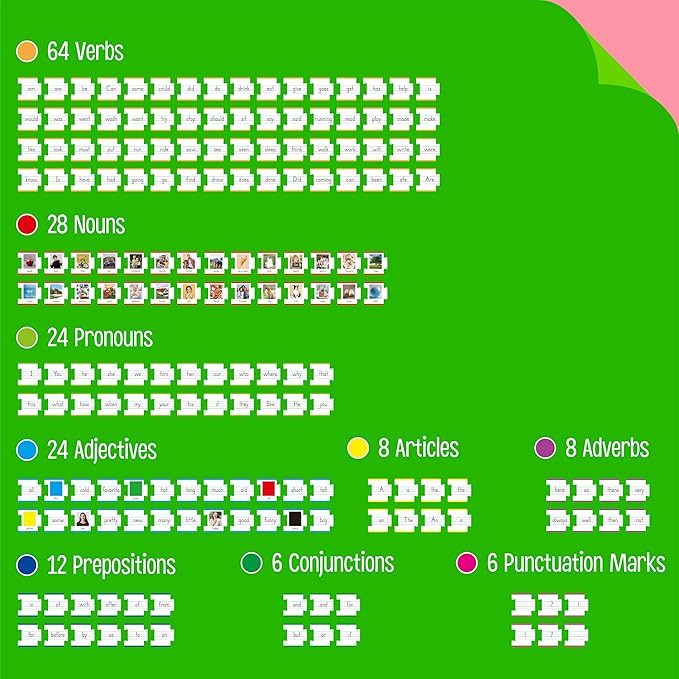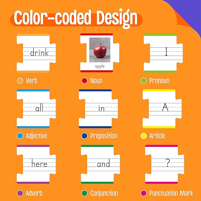 - Color-coded Design: The puzzles are designed with a color-coded system to make sentence construction and word recognition easier. Each word is categorized by color to represent its part of speech. This design helps children visually identify word roles, making it simpler to form grammatically correct sentences and strengthen their understanding of language structure.