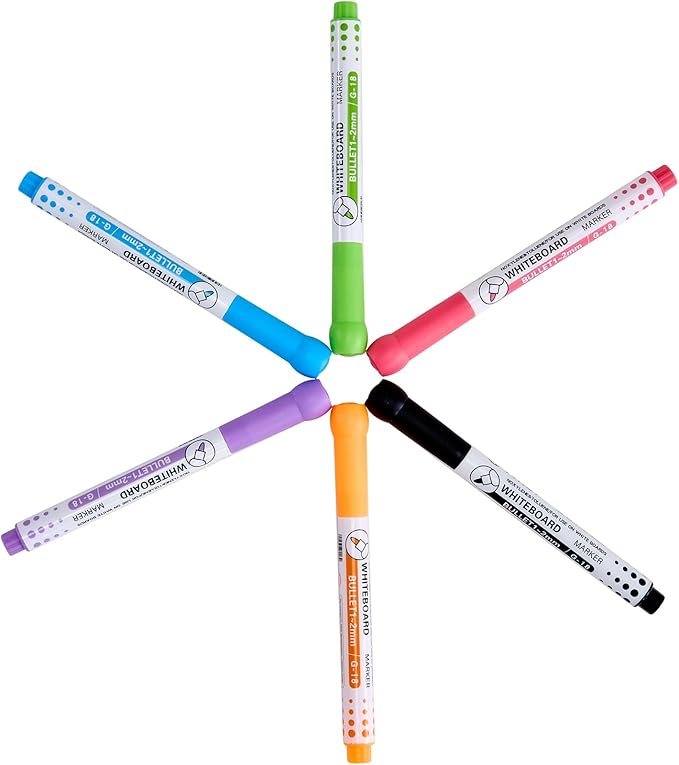 - Low-Odor Markers: These low-odor markers come in 6 vibrant colors, perfect for home, school, or even the office. They wipe clean easily with a dry cloth or eraser, leaving no remains behind—just a clean surface ready for the next masterpiece.