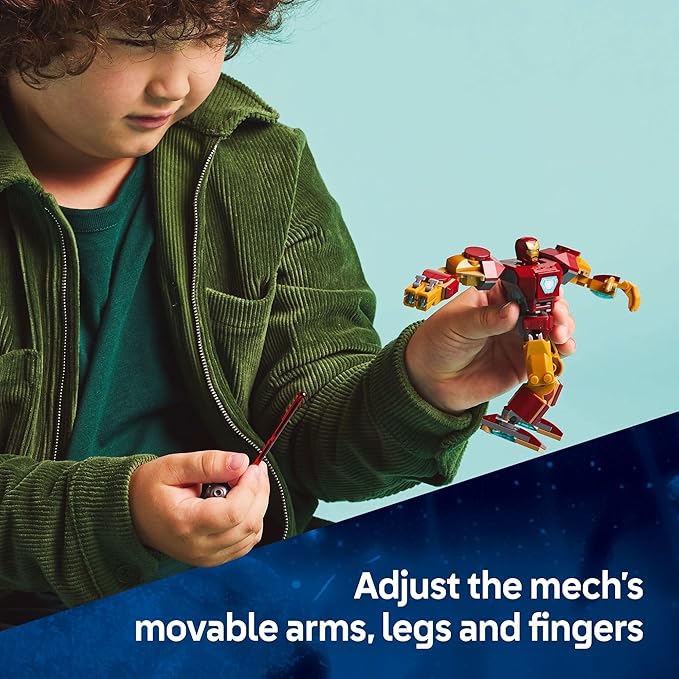 - POSABLE MECH TOY – The mech is a posable figure with movable arms, legs, fingers and the torso, which opens to reveal a cockpit that can hold the Iron Man minifigure