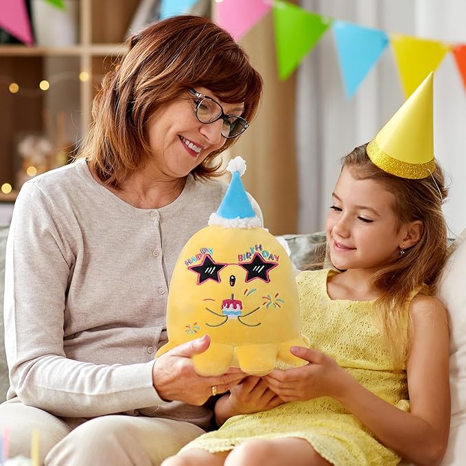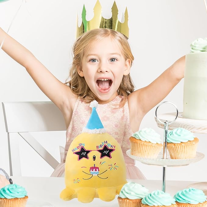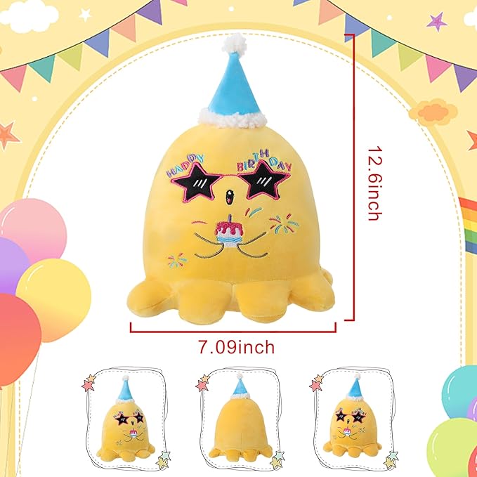 - 1. Adorable Birthday Design: This LeYoHa Octopus Stuffed Animal features a delightful birthday theme with a blue birthday hat, birthday sunglasses, and embroidery of birthday cake and fireworks. Celebrate birthdays in style
