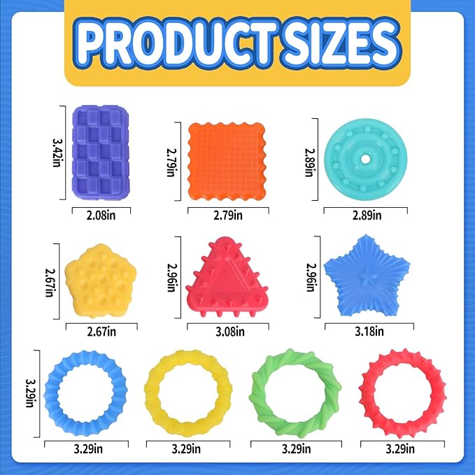 - 10 Textures Sensory Fidget Toys: Our textured, extra durable, bright, stretchy, calming sensory toys provide a unique tactile experience with 10 different textures and tensions, including 4 fidget bracelet, 6 sensory squishies. Each sensory shape is designed with different color and shapes and different texture, meet all your kids sensory needs through squeezing,pulling and touching these textured shapes. Great christmas stocking stuffer toys for toddler.