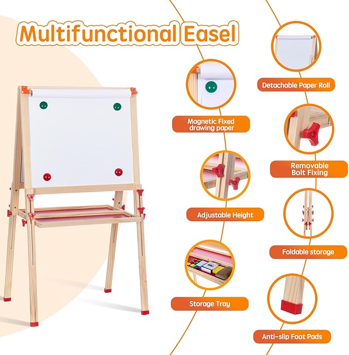 - 【SAFETY MATERIAL】 The kids' easel is made of high-quality natural wood, without the use of paint, committed to safety and sustainability. Each toddler easel is designed with child-safe screws, carefully polished design, and non-slip foot pads to provide your child with a safe and worry-free creation and learning environment. Fixed accessories on both sides of the easel to increase its stability.