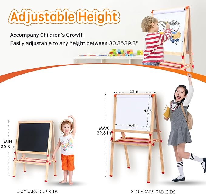 - 【ADJUSTABLE HEIGHT DESIGN-Accompany children’s growth】 The height of the kid's easel is adjustable from 30.3 inches to 39.3 inches and can accommodate a paper roll width of 17.3 inches. This easel accompanies your child's growth, ensuring that your little artist can express their artistic talents at any stage of development, meeting the art and learning needs from kindergarten to elementary school. It will be a perfect gift for children for Christmas, New Year, birthday gifts, etc.