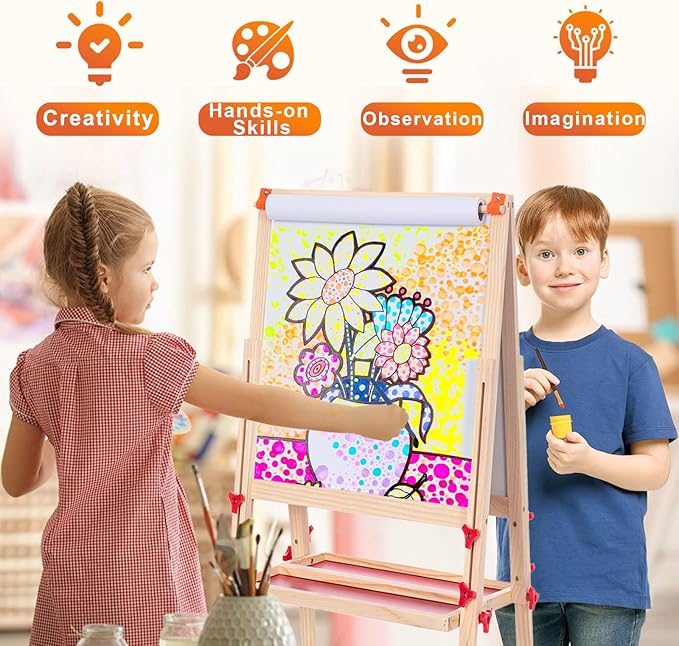 - 【DUAL-SIDED MULTIFUNCTIONAL】 This kids' easel features a magnetic whiteboard, chalk blackboard, and paper roll holder. The attached magnetic button can also effectively hold art paper. It provides a variety of ways to draw, write, and create. The wide board surface provides enough space for children to doodle, practice letters, etc. It can be used by two children at the same time, which is perfect for drawing, learning, and endless fun.