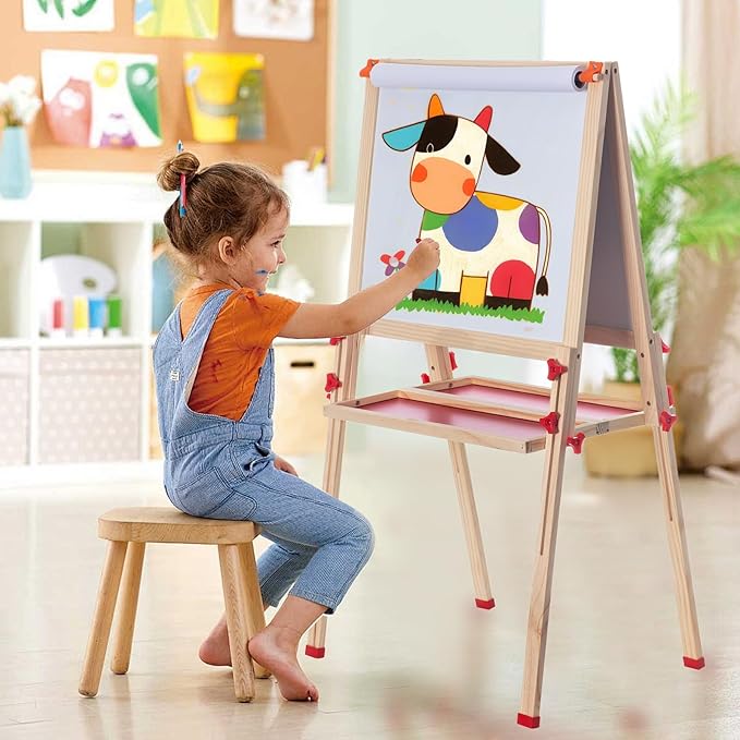 - 【SAFETY MATERIAL】 The kids' easel is made of high-quality natural wood, without the use of paint, committed to safety and sustainability. Each toddler easel is designed with child-safe screws, carefully polished design, and non-slip foot pads to provide your child with a safe and worry-free creation and learning environment. Fixed accessories on both sides of the easel to increase its stability.