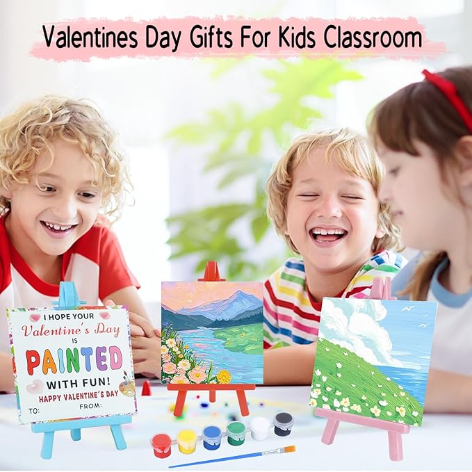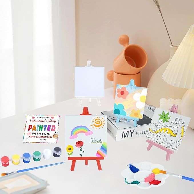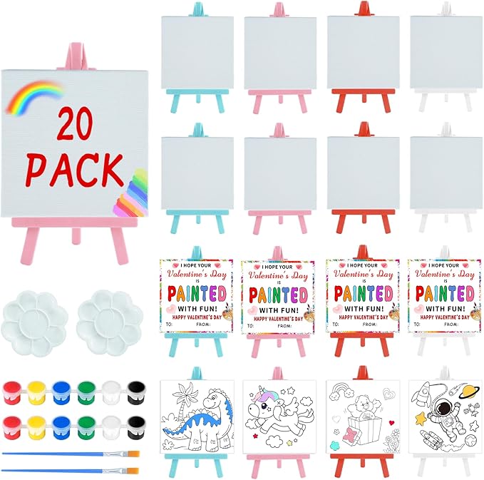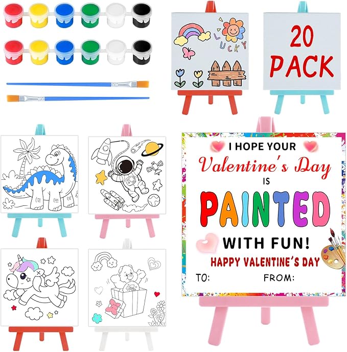 Valentines Day Gifts for Kids - Valentines Day Cards for Kids School - 20 Pack Watercolor Paint Set, Acrylic Paint Canvas Brushes Easel, Stationery Exchange for Boys Girls Class Classroom Party Favor