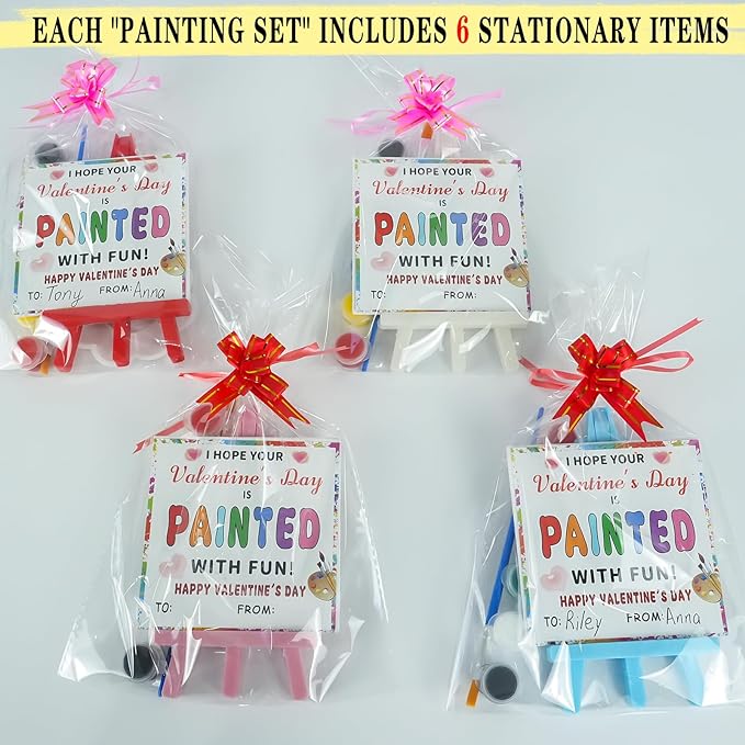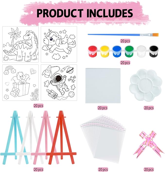 - Valentine acrylic paint set package includes: 20 canvas, 20 plastic easels, 20 cards, 20 paint brushes, 20 acrylic paint, 20 clear bags, 20 bow ribbons & 20 watercolor palette