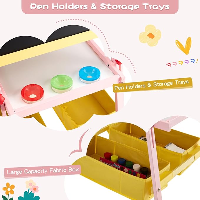- UNIQUE DESIGN: This easel is brightly colored to meet your child's preference, with an added fabric storage box at the bottom. This design can stimulate children's imagination and creativity, and also improve their color perception and organization