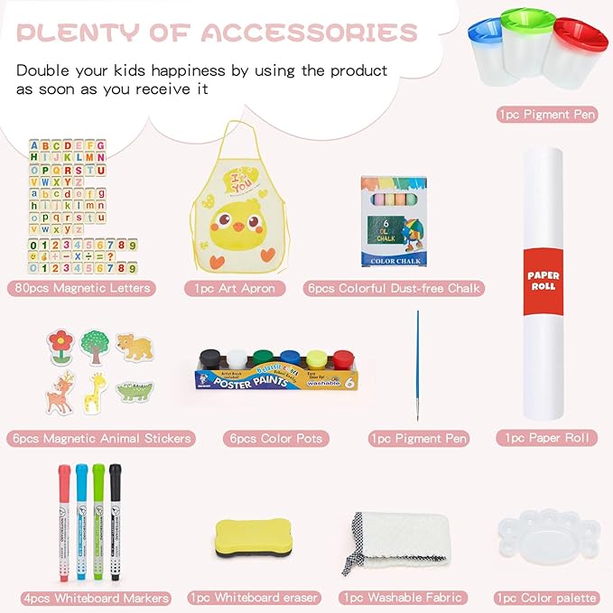 - VARIOUS ACCESSORIES: Our kids easel and paint setl contains magnetic stickers, dust-free chalk, whiteboard markers, color pots so on a total of more than 100 kinds of accessories. It can be used immediately upon receipt, doubling your child's happiness