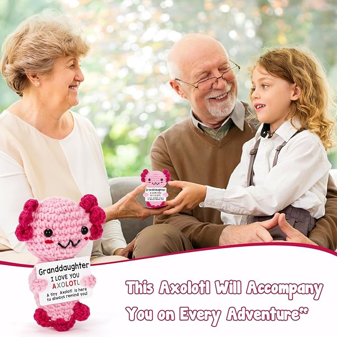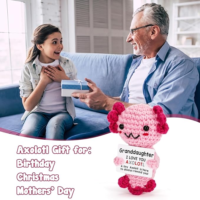 - Gifts for Granddaughter: This adorable, handmade axolotl plush is a thoughtful gift from grandma, grandpa or nana to show your granddaughter how much she’s cherished. Made from soft yarn, it offers a comforting and cute reminder of your love.