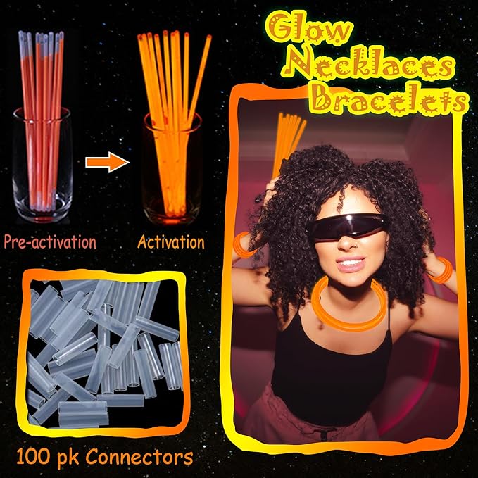 - Glow Sticks Light up Your Night - Our neon glow stickers set come with 100 packs of glow stickers and connectors for making different shapes, such as bracelets, necklaces, headbands and belts. Bend and shake to activate these glow sticks, which are a huge hit at the dark night party, easy to assemble and remained colorful for quite a long time