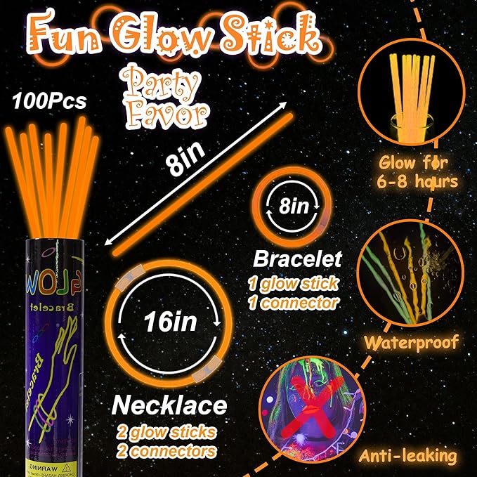 100 pk 8" Orange Glow Sticks Bulk Party Favors, Light up Glow Necklaces & Bracelets in the Dark Party Supplies For Christmas Halloween Birthday Neon Party (100 * Orange)