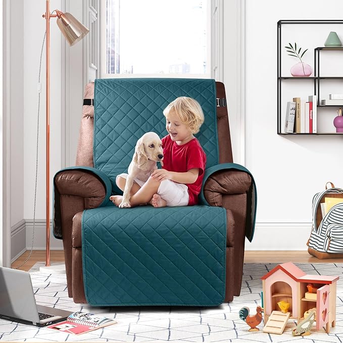 KinCam 100% Waterproof Recliner Chair Cover, Reclining Couch Covers for Pets, Dogs, Recliner Couch Slipcover Furniture Protector with Elastic Straps for Kids(23.6", Peacock Blue)