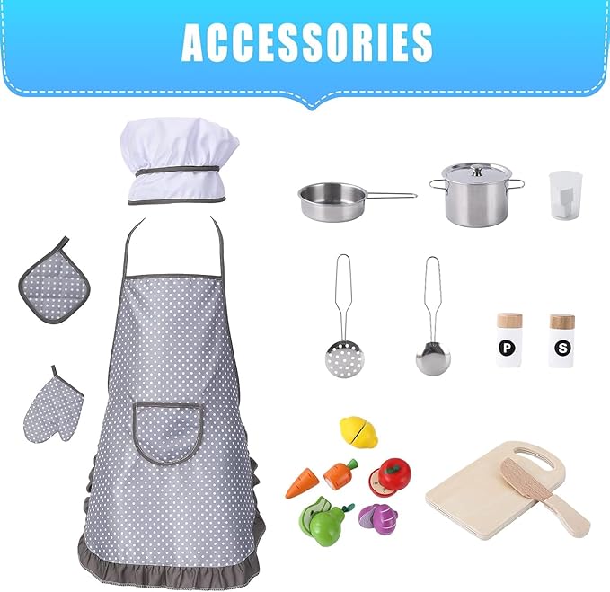 - Interactive Play Features:There is 1 wooden kitchen playset and 20 pcs cookware Accessories - chef hat, apron, oven mitt, pot, seasoning jar, plate, spatula, ice cube models, wooden cutting fruit and vegetables set. The set will be a ideal gift to help kid learn the basic skill about kitchen and cooking. The spacious design allows two kids to play together, encouraging teamwork and creativity.
