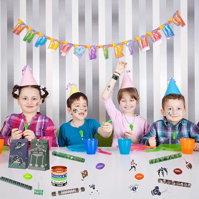 - FOOTBALL PARTY DECORATIONS GIFT SET: This football themed party favors set contains 12 football silicone bracelets,12 whistles, 12 football keychain, 12 slap bracelet, 12 tattoo stickers, 12 football fidget spinners, 12 gift bags, 50 football stickers. Kids and adults alike will love these football party supplies! It's the perfect gift for kids football birthday party decorations!