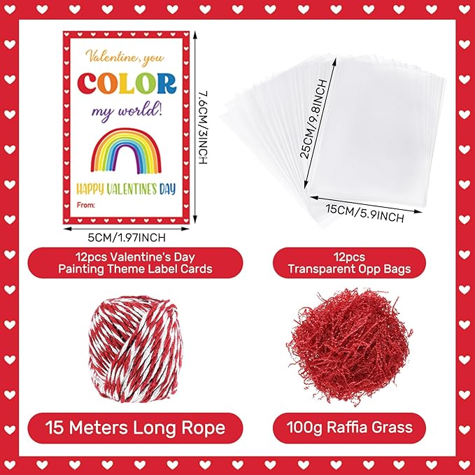 - Package Includes: you will receive 12 sets of Valentine mini paint including 12 mini canvases, 12 mini easels, 12 paint trays, 12 paint brushes, 12 plastic bags, 12 Valentine's Day theme cards, 1 rope, and 100g red raffia paper filaments, you can painting at canvas as a gift to express your love