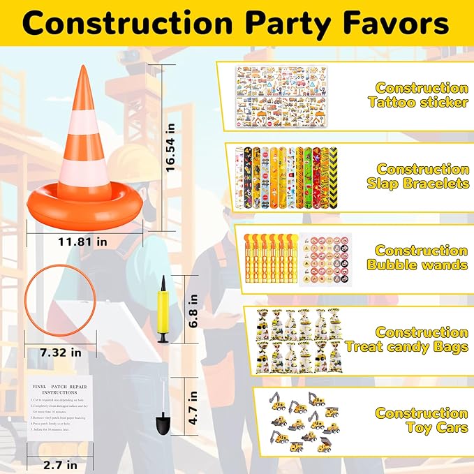 - Construction Themed Party Favors Set- Our Set includes 12PCS Construction Temporary Tattoos,12 Mini Shovel,12PCS Slap bracelets,12PCS Treat candy bags,12PCS MINI construction toys,12PCS Bubble wands(with bubble wand mini stickers,you can match your own bubble wand).Each set includes 3 inflatable construction cone,6 colorful plastic rings, 2 repair patches and a portable air pump for easy setup and breakdown.