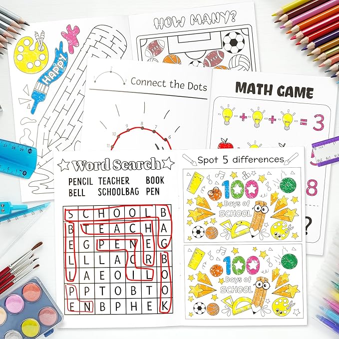 - What You Get: The pack contains a set of 24 100 days of school-themed mini-game activity books. It includes 6 different styles. Each activity book has 10 sheets, a total of 20 pages, including 20 different games to ensure children have fun learning in the classroom.