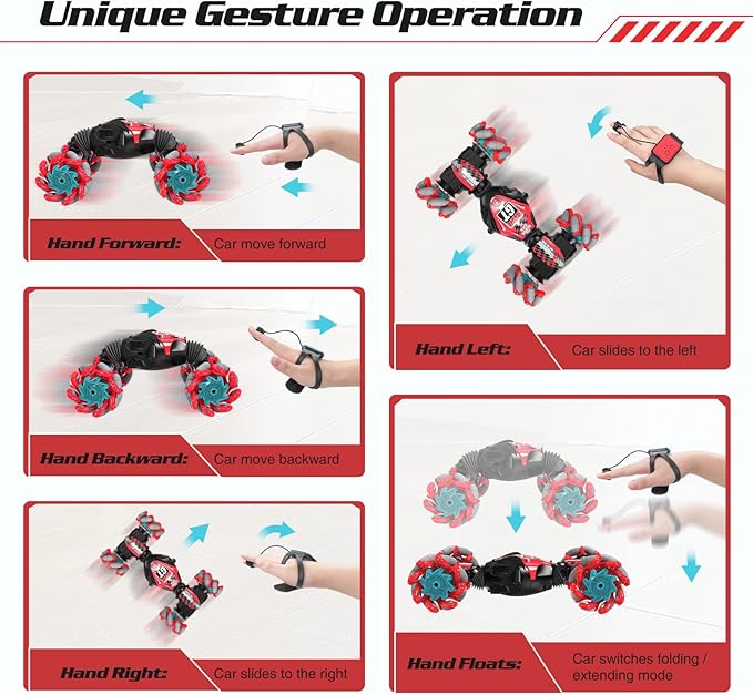 - 🚗 【2 Control Modes】- Different from other gesture rc car,The rc stunt car is not only can be controlled to move by traditional remote control,but also by a watch. Change your gesture,the RC car can sensing the change of your gesture to drives and transforms as you like.