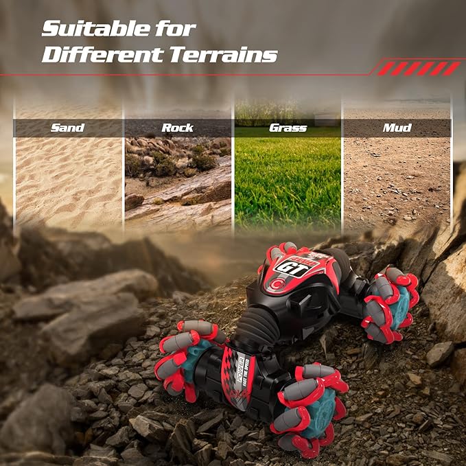 - 🚗 【Durable and Safe Explosive Wheel】- The cool gesture sensing rc stunt car is made with high quality durable ABS plastic and spray painting. With high-quality soft and elastic rubber tyres, shock-absorption, grip extremely strong, skid resistance, doesn't fear the slippery road, allowing the car to drive in different terrains at ease.