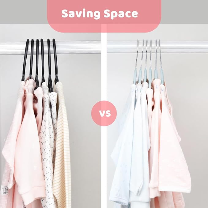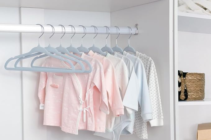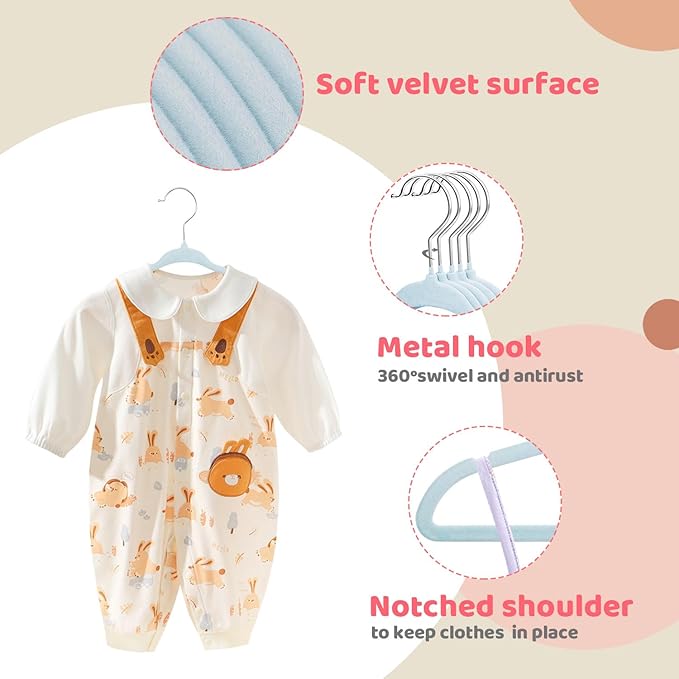 - [Baby Velvet Hangers]: The velvet baby hangers are made of premium quality ABS plastic and covered with non-slip soft plush velvet surface, feels so comfortable to the touch, and helping your clothes do not cause any shoulder bump and get wrinkled.